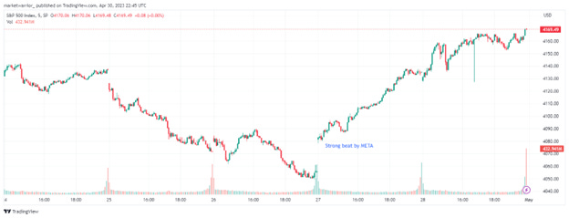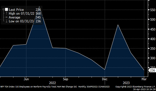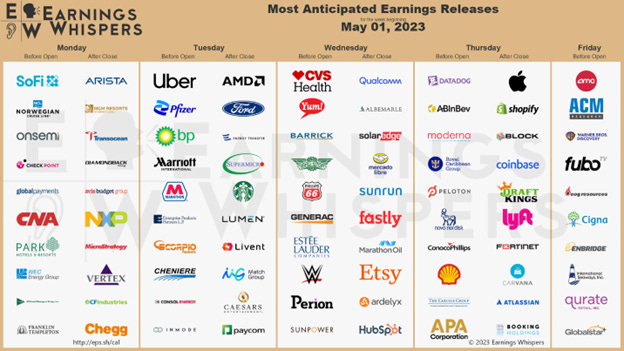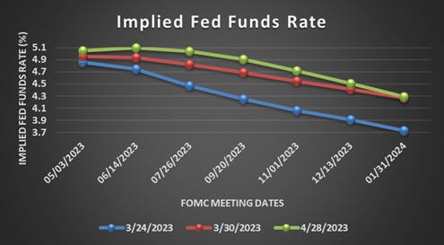 A 25bp hike is priced in the market for the May meeting, but the market is pricing just 21% odds of a June hike and 23% of a cut in July. Pausing on fears of credit driven slowdown is likely to elicit a positive response from the market. However, if the Fed tries to keep a hike in play for June (data dependent) it would read negative for stocks. Since there will be no SEP (summary of economic projections) this meeting, FOMC commentary on credit contraction, growth risks, and Powell’s presser will be key.