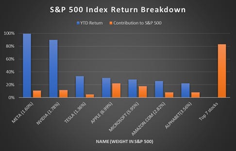 When I drilled down to see what’s holding the S&P index, it was surprising to see that SEVEN stocks are responsible for 83% of the S&P 500’s YTD 9% return. This means that the primary barometer, the “S&P 500 index” used as the health of corporate America and cited by presidents as a measure of their handling of the economy — often comes down to just seven companies.