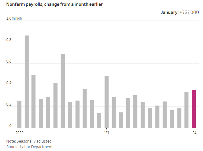 Headline numbers - US economy added 353k jobs in Jan, compared to an upwardly revised 333K in December, and way above market forecasts of 180K. It is the biggest rise in employment in a year, signaling the labor market remains tight.