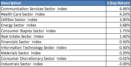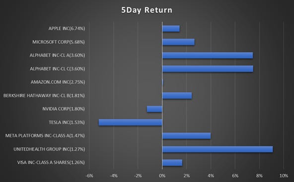Last week (ending April 6th), the S&P 500 index rose by 1.32%, as banking crisis fears seem to be abating. However, we didn't ignore the miss in PMIs, rise in jobless claims, and other data pointing to a slowdown in growth. The index rose higher because the stocks, especially the mega-cap tech companies, gained, driving the overall index higher. The bars in the chart below show the 5-day return in percentage terms for each company, and the numbers in parentheses show the relative weight of the company on the index. For example, Alphabet gained close to 8% over the week, while it holds a 3.60% weight in the index.