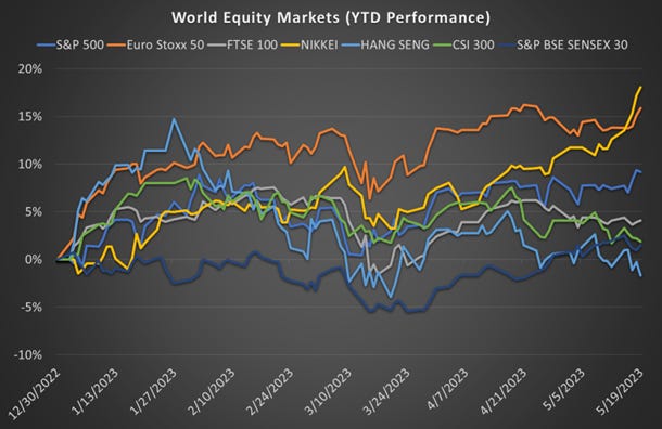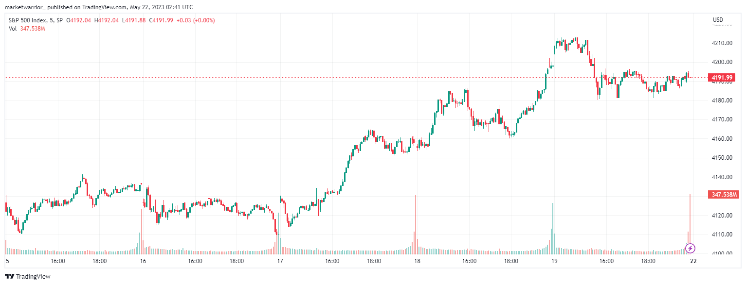 Stocks continued to trade higher this week, displaying a generally positive bias towards the headline debt ceiling negotiations. However, on Friday, headlines emerged of Republicans walking out of the negotiations. Even as I write this piece over the weekend, talks between the White House and House Republican negotiators broke down, with both sides playing the blame game. Either way, President Biden and the House Speaker agreed to meet on Monday afternoon to prevent a catastrophic default. Meanwhile, as of this morning, Treasury Secretary Janet Yellen stated that the US is unlikely to reach mid-June and still be able to pay its bills. Yellen has previously warned that the US could lose its ability to pay all its bills as soon as June 1, putting the country at risk of a catastrophic default. While tax payments are expected in mid-June, the challenge lies in reaching that date, she said.