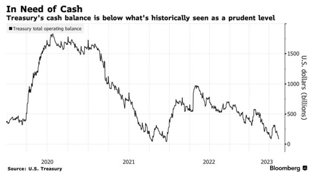 The market is also paying attention to the massive fund raising the US Treasury will undertake once the US debt limit has been raised, as the Treasury would need to replenish its coffers. The Treasury will need to rapidly increase Treasury-bill sales, potentially draining liquidity from the banking sector, raising short-term funding rates, and tightening the US economy. This liquidity drop could have a negative impact on risk markets and economic growth, as there would be more people holding T-Bills and fewer available funds for other investments. While there is a possibility that investors parking their cash at the Federal Reserve's reverse repurchase agreement facility (RRP) could play a role in mitigating the reserve drain, there are concerns that reserves will become scarce, affecting funding markets and potentially leading to a risk-off environment.
