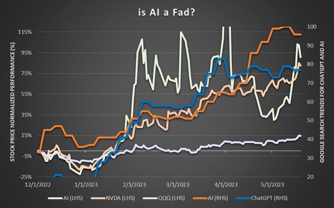 The hype surrounding AI is still prevalent in the market, benefiting megacap tech stocks. Most recently, Stanley Druckenmiller expressed his positive views on this technological innovation. However, 13F filings revealed that billionaire investing titans, including Stanley Druckenmiller and David Tepper, loaded up on stocks benefiting from the artificial intelligence boom during the first quarter. They could possibly be playing retail investors, as they won't disclose right away when they sell their AI stocks. Interestingly, when looking at the Google search trends, AI is still trending upward (orange line below), so it is not surprising that stock tickers 'AI' and 'NVDA' continue to rally 🚀.