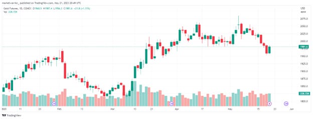 Gold prices experienced a significant decline last week as media headlines around the debt ceiling circus became more positive, reducing the perceived risk of the US defaulting on its debt. We could potentially see further downward pressure on gold once the debt ceiling is actually raised, as investors realize that it is better to earn 5% on the USD rather than holding an asset driven by sentiment and without interest payments.