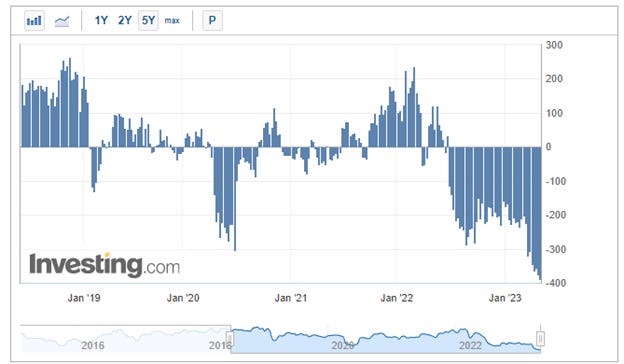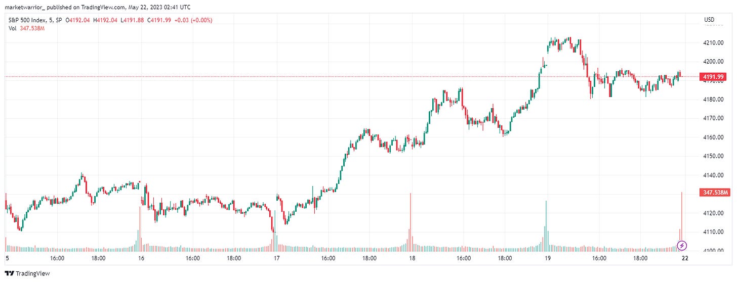 In the last few weeks when negotiations were not progressing, stocks did not experience a significant decline. In my opinion, there is more to the rally than just the headlines. I believe positioning is playing a significant role in this melt-up episode, as speculative positioning in S&P 500 futures is near a record short position (betting on price decrease). When the net position is a record net short, it implies that speculators are holding a historically high number of short contracts relative to long contracts. As a result, any positive news leads to a rally mode as shorts are likely capitulating and closing their positions. Consequently, the price of the index goes up since there are more buyers of the index now. Additionally, sentiment in the FinTwit and trading community is clearly negative, with many speculators eagerly awaiting Treasury Bill issuance once the debt ceiling is raised. More on that later.