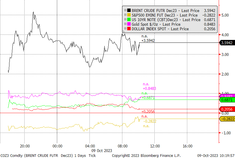 Oil – So far this morning Brent oil is +3.59%, having been around +5% a little earlier in the session. To put this in some context it was down over -11% last week. We are watching reports about the influence of Iran and its involvement, as the worst-case scenario would be the conflict expanding to draw other nations. Despite US sanctions on Iran, its crude production has recovered to above 3.1mbpd, a five-year-high, with exports running at around 1.5mbpd. In an already undersupplied oil market, disruptions to Iranian exports either through broadening conflict or tougher sanctions could have a significant impact on oil prices in the near term. This WSJ article has gotten a lot of attention over the weekend, it says that Iranian security officials helped plan Hamas’s Saturday surprise attack on Israel and gave the green light for the assault at a meeting in Beirut last Monday, according to senior members of Hamas and Hezbollah, another Iran-backed militant group. For a deeper dive into the conflict, here are two opinion pieces from Bloomberg: