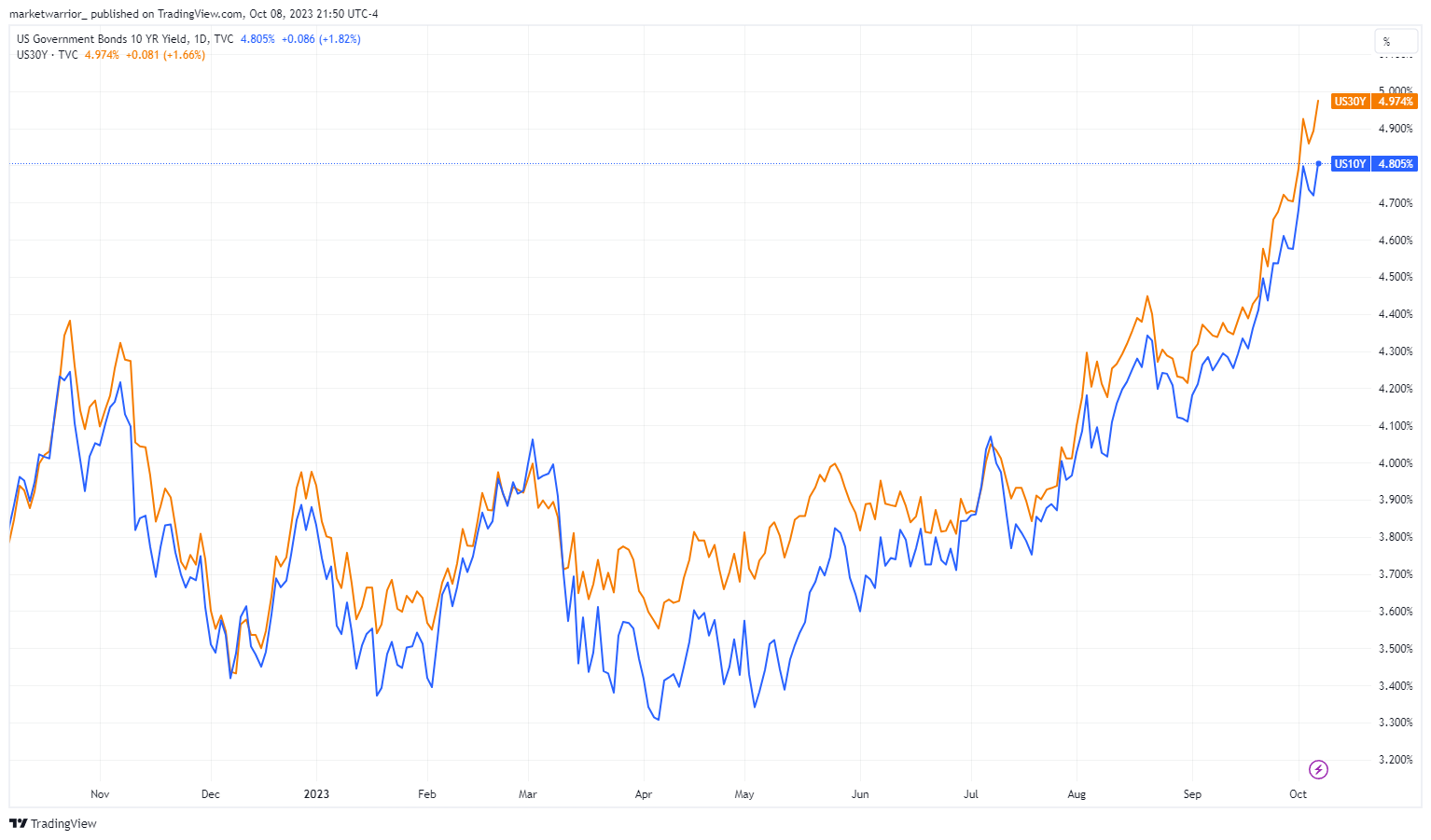 The 10Y and 30Y US Treasuries yields have moved higher by 150bps and 139bps respectively in the last six months. Since March 2023, the Federal Reserve has raised the overnight Fed Fund rates by 75bps to the 5.25-5.50% range, mainly impacting the short-term funding markets. The move in 10Y and 30Y Treasuries implies that borrowing costs have risen not only in the short-term funding markets but also in long-term funding markets.