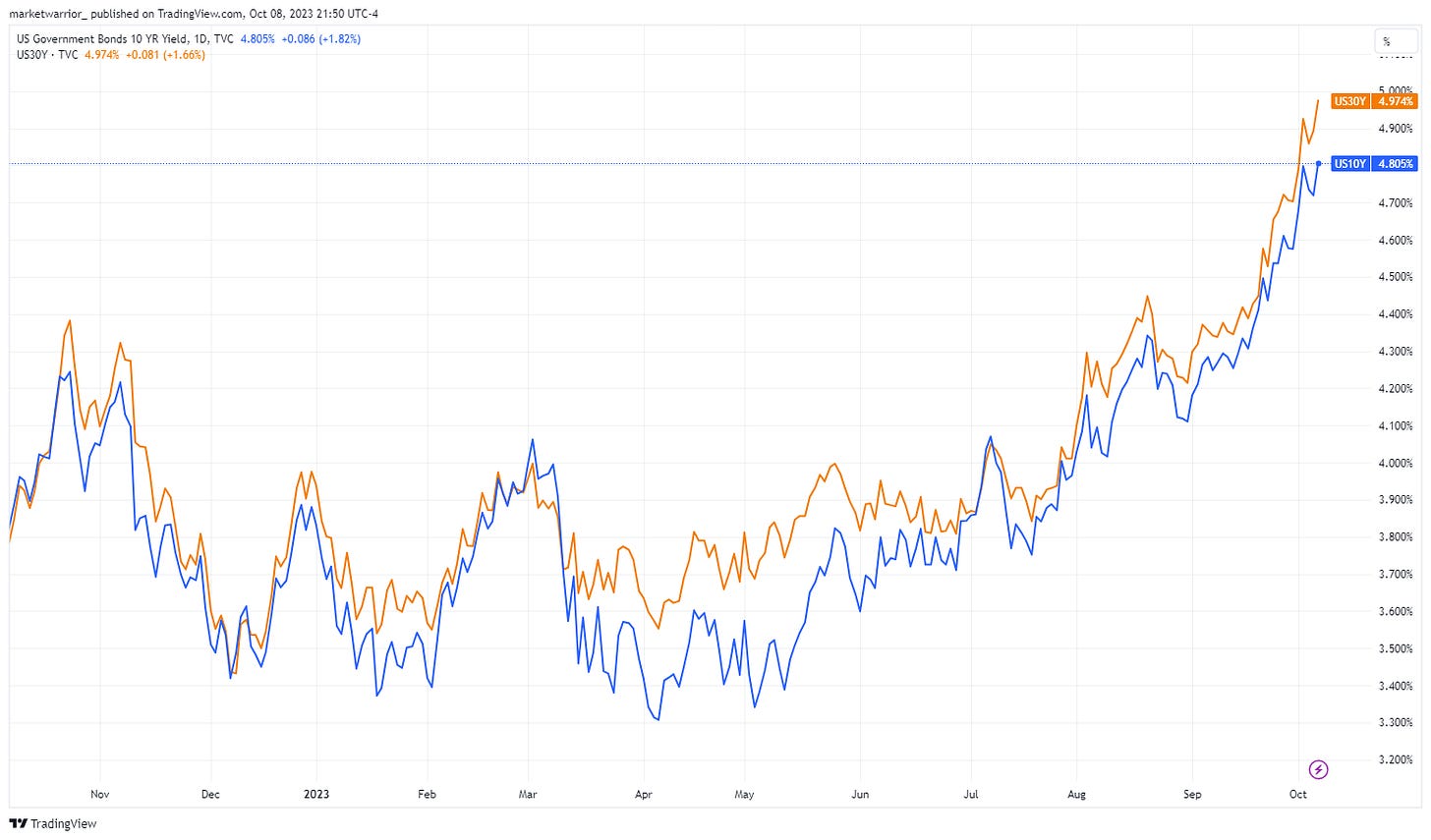 Higher funding costs for corporates, munis, and governments - Similar to consumers, all entities relying on debt to finance also face higher funding costs. Yields at these levels on a sustained basis increase the nominal cost of capital for even the safest borrowers. The cost of capital will be well above nominal income and earnings growth. That is not sustainable for an extended period. Further, higher funding costs for corporates could lead to bankruptcies and restructuring of debt.