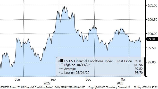 The FOMC will have the Senior Loan Officer Opinion Survey (SLOOS) data, and Powell will likely provide a preview of it during the presser. He might make a reference to the severity of tightening of credit conditions from the regional banking crisis which started in March, but the committee would likely want to see some confirming evidence of an impact on economic activity in the data before sending a stronger signal that they are on hold. Note that as per DB, a one standard deviation tightening of C&I bank lending conditions was approximately equal to two to three 25bp rate hikes after accounting for spillovers to broader financial conditions. FWIW, based on the weekly Fed reports, there is no sign of a sharp drying up of credit in aggregate bank data for the week of April 19th. Even deposits are stable at small and large banks.