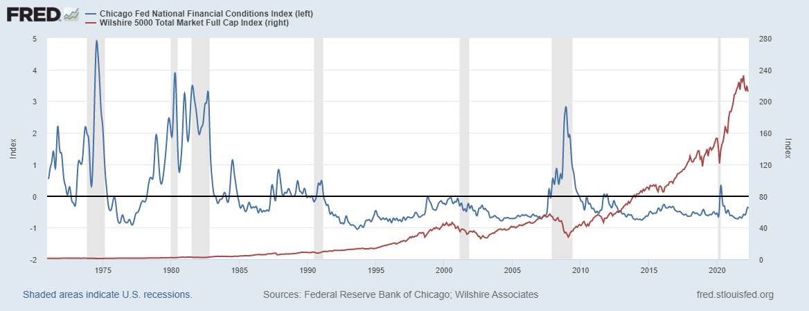 How does the Fed know that its policy is having the desired effects on the economy? They monitor the financial conditions index, such as the Chicago Fed's National Financial Conditions Index (NFCI) which provides a comprehensive weekly update on U.S. financial conditions in money markets, debt and equity markets, and the traditional and "shadow" banking systems. Positive values of the NFCI indicate financial conditions that are tighter than average, while negative values indicate financial conditions that are looser than average.